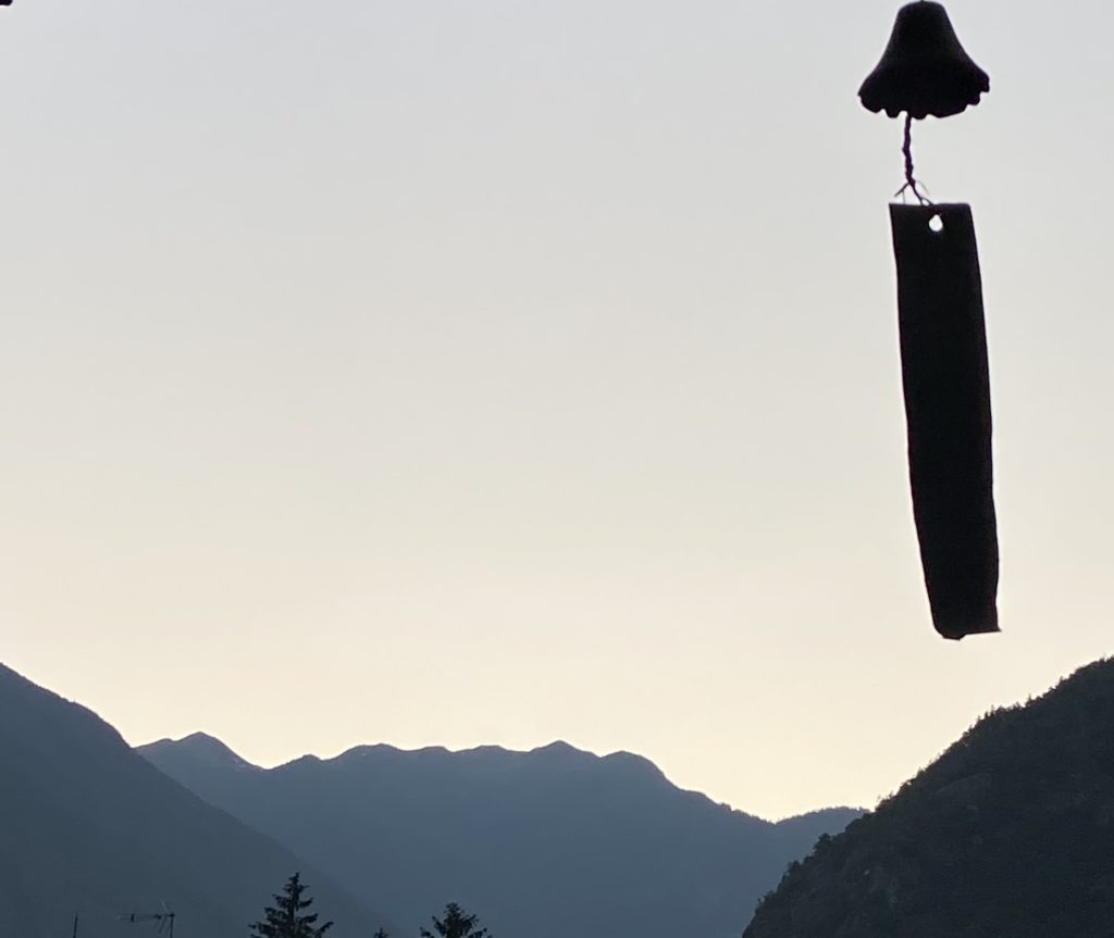 写真は 日本で買って我が家の窓辺に飾ってる風鈴とアルプスの山並み