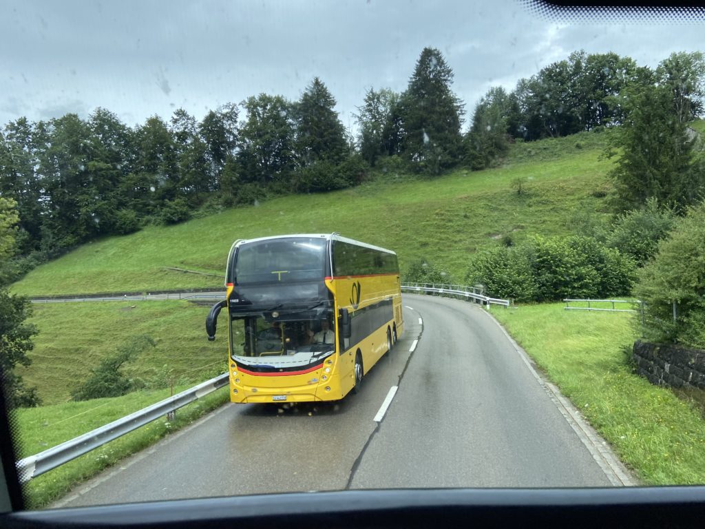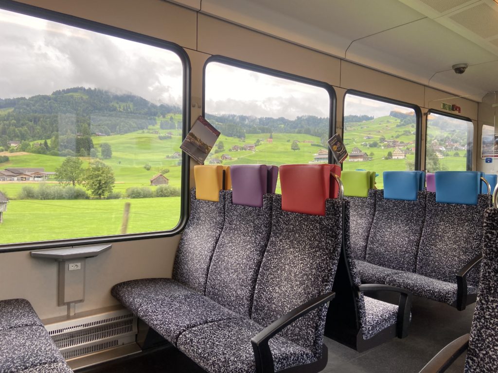 写真は アッペンツェル地方のカラフルで可愛い電車車内と二階建てバス