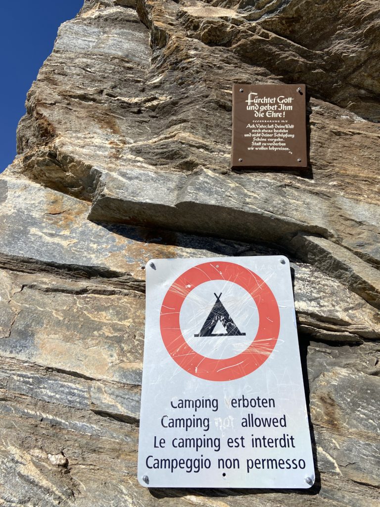 ↑ヘルンリ小屋登り口付近にある「テント設営禁止」の張り紙。ドイツ語、英語、フランス語、イタリア語で書いてあるのですが、誰かがいたずらして英語のnotを消し「キャンプOK」にしてます。いけませんねぇ。ドイツ語も「禁止」のverbotenのvを消してerboten(提供します)に… とりあえず犯人は、フランス語とイタリア語はわからなかったらしい。
