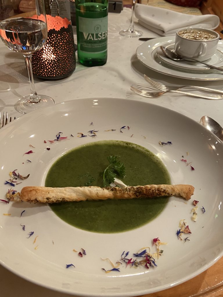 ↑ネトル(イラクサ)のスープ。鮮やかなグリーンと、濃厚クリームスープが美味の、ここの定番のひとつ