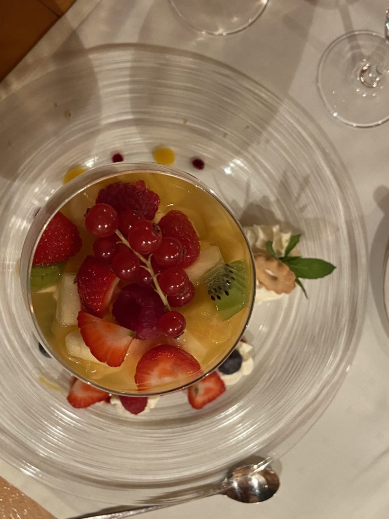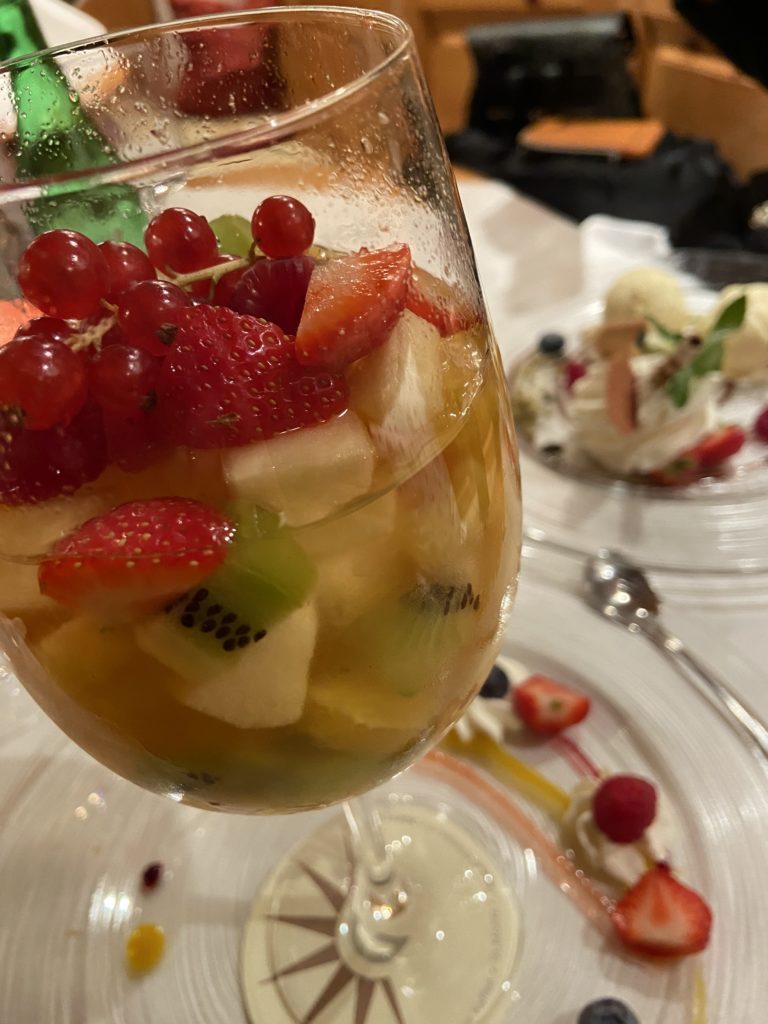 本日のデザートは、フレッシュフルーツ・カクテル。大人の味のリキュール入りで美味しかった♪
