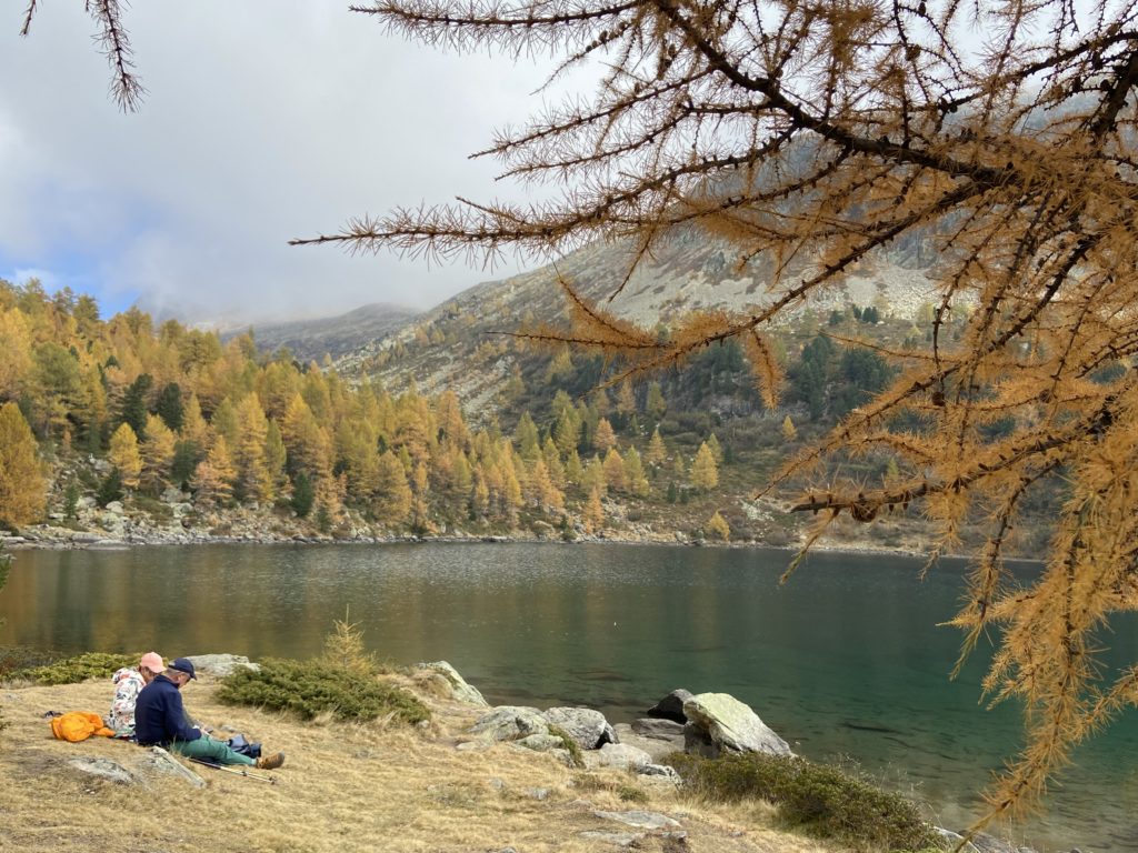 30分も歩かずに湖へ。カラマツの林の合間から見え始める美しい色の湖面に、毎年の事ながらハッとする。