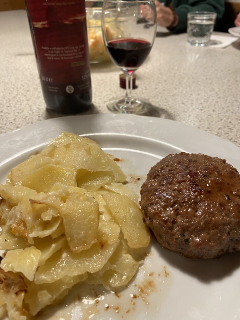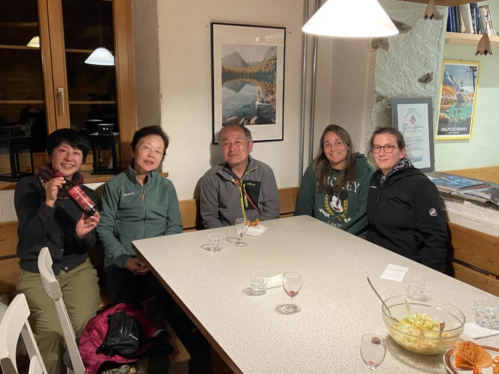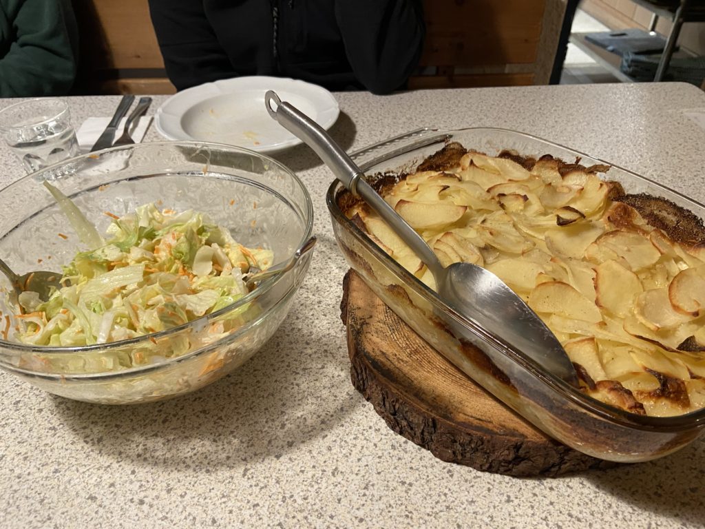 スイスの山小屋では大テーブルにて他の宿泊客の方々と大皿から取り分けていただきます。