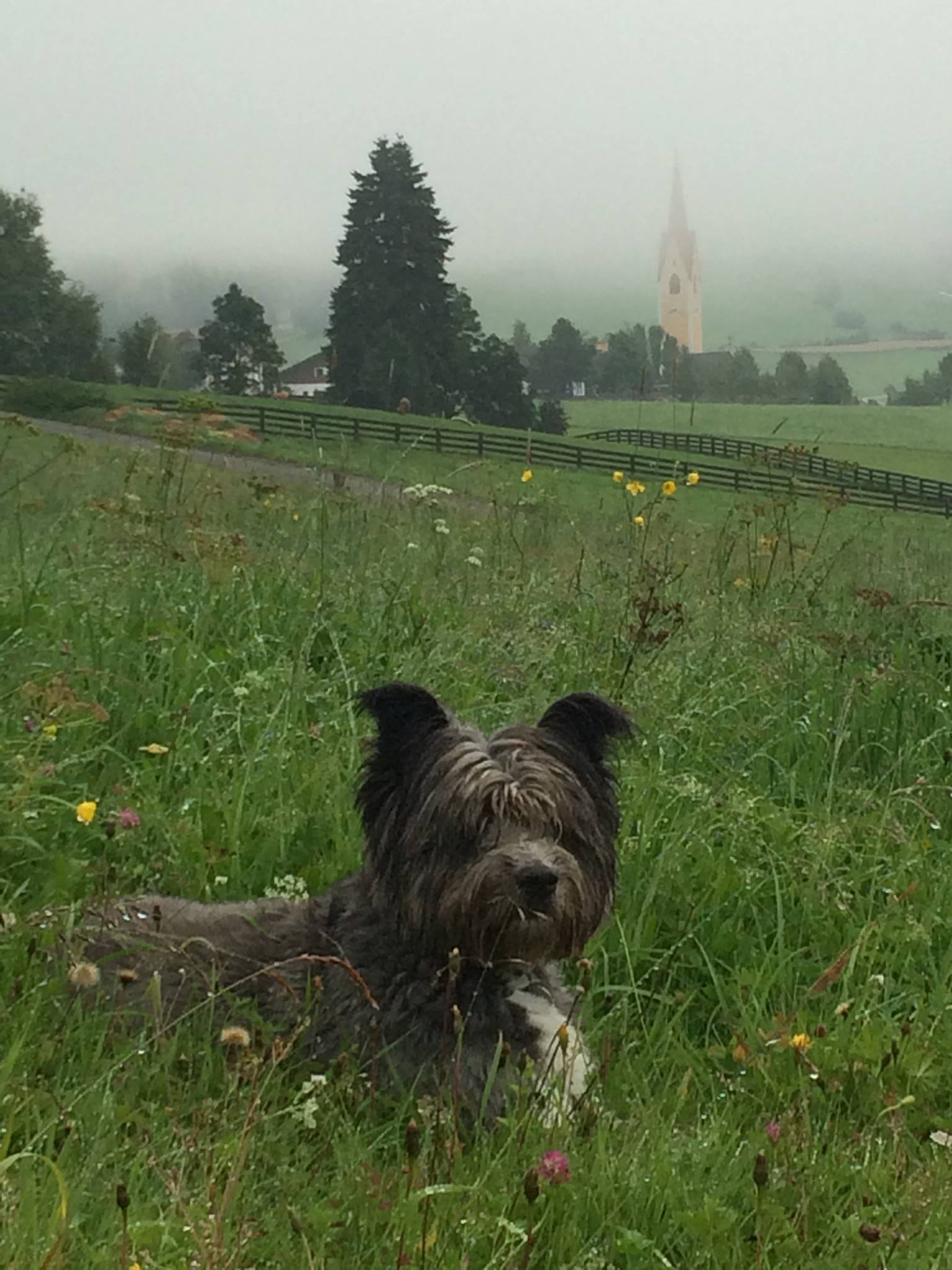 写真は 無駄吠えゼロの 穏やかな愛犬イーラさん。霧の朝のお散歩にて。